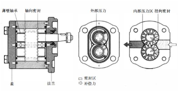 在輸壓力油的齒輪齒之間的間隙末端,由軸承實現(xiàn)密封。通過將工作壓力引入軸承后部,可控制齒輪齒和鈾承之間的密封區(qū)。特殊密封為該區(qū)域的邊界。齒輪齒尖的徑向間隙由內(nèi)力密封,此內(nèi)力將齒尖緊壓在外殼之上。