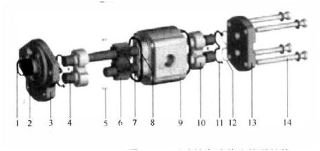 1一擋圈;2一軸封;3一前蓋;4一滑動軸承;5一定心銷;6一齒輪;7一齒輪(主動);8一外先密封;9一泵外殼;10一軸承:11一軸向密封區(qū);12一支架;13一端蓋;14一固定螺釘