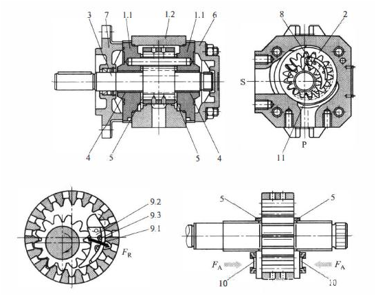 1. 1一泵體;2一軸承荒;2一內(nèi)齒圈;3一小齒輪軸;4一滑動軸承;5一軸向板;6一端蓋;7一安裝法蘭;8一止擋銷;9一配油盤組件;9一配油盤;9.2一配油盤架;9.3一密封輥;10一壓力區(qū);11一液壓靜壓軸承